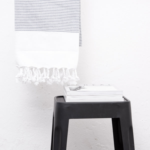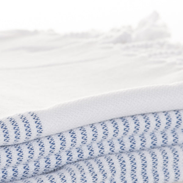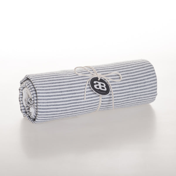 Hamamtuch Klassiker in weiss mit dünnen, blauen Streifen. Unser Klassiker ist das meistverkaufte Tuch und eignet sich perfekt als Strandtuch, als Yogatuch oder als Babytuch.