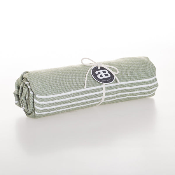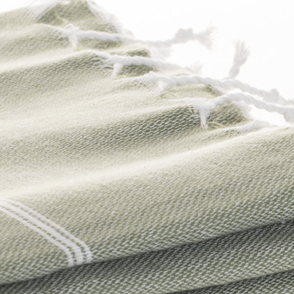 Hamamtuch Olivo in olivgrün mit weissen Streifen. Mit dem Olivo kommst du in der Badi oder am Strand bestimmt gut an. Zudem eignet es sich perfekt für den nächsten Saunabesuch oder für deine geplanten Ferien am Meer.